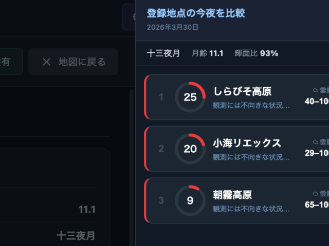 たくさんの方から要望をいただいていたマイ観測地の比較機能を実装しました。下のスクリーンショットのように「登録地点の今夜の比較」ボタンを押してください。登録した地点最大10か所をまとめて比較できます。画面の右側にスコアが高い順に並びます。カー...